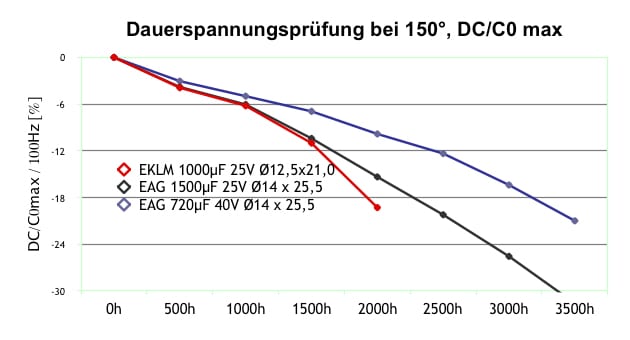 Kondensatoren von Frolyt erreichen bei Dauerspannungsprüfung bei 150°C die 3500h.