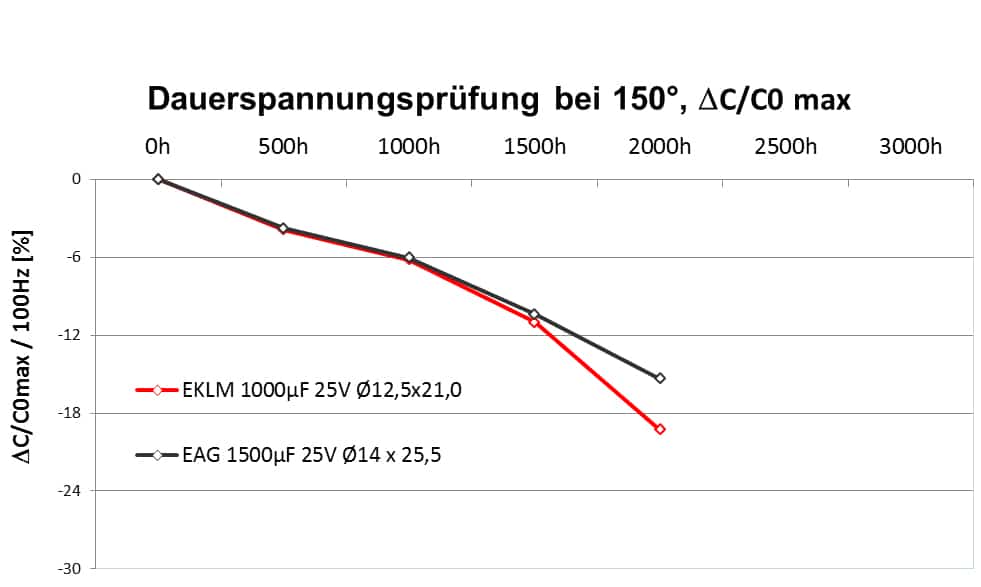 Radiale und axiale Kondensatoren von FROLYT mit einer Nennspannung von 25V haben problemlos die 2000h Lebensdauer bei 150°C erreicht. Die Dauerspannungsprüfungen werden fortgesetzt und regelmäßig aktuell veröffentlicht.